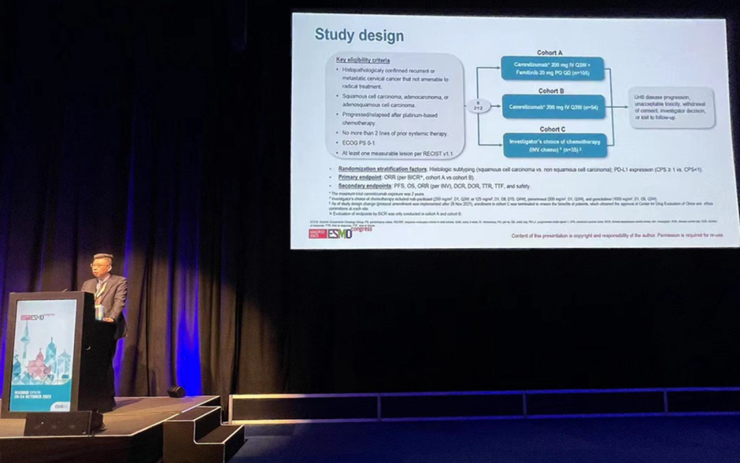 有望为宫颈癌患者带来治疗新选择10月22日,asiagame医药创新药卡瑞利珠单抗联合法米替尼对比卡瑞利珠单抗单药或研究者选择的化疗治疗复发转移性宫颈癌随机、开放、对照、多中心的Ⅱ期临床研究(SHR-1210-Ⅱ-217) 亮相2023 ESMO大会简短口头报告现场3。该研究由复旦大学附属肿瘤医院吴小华教授团队开展,吴小华教授在现场公布了该重磅研究进展。研究结果显示,在既往以铂为基础化疗失败后复发或转移性宫颈癌患者中,与单独使用卡瑞利珠单抗或研究者选择的化疗相比,卡瑞利珠单抗联合法米替尼显著提高了抗肿瘤活性,安全性可控,有望为晚期宫颈癌患者提供新的治疗选择。